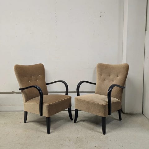 Nämä hienot 60-luvun nojatuolit etsivät uutta kotia. Design by Johannes Andersen. Tuolin nimi Lady. Tuolien rungot hyvässä kunnossa ja kaikin puolin tukevat. Verhoilut ehjät ja siistit. Myydään parina.