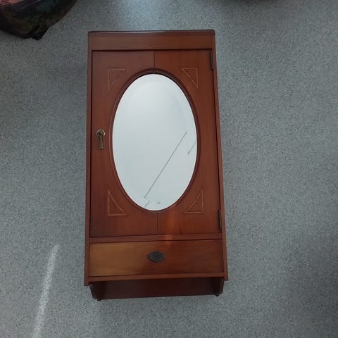 Vanha puinen peilikaappi, jossa keskellä peiliovi ja alhaalla vetolaatikko