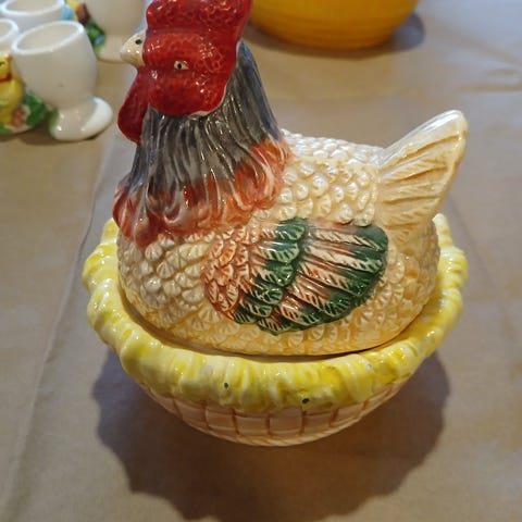 Myyn pääsiäiskanan/kukon, jonka materiaali saattaisi olla fajanssia tai valkosavea. Ulkopohjassa on numero 521 ja lähes poispyyhkiytynyt teksti oletettavasti IMPORT. En löydä esineestä mitään virheitä. Korkeus n. 11,5 cm, pituus n. 12,5 cm. Alaosaan voi laittaa vaikka suklaamunia ja sitten yläosa kanneksi päälle.