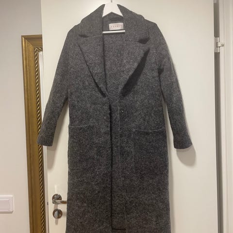 Object uudenveroinen, kerran pidetty tummanruskea villakangastakki , jossa takahelma on etuosaa pidempi.