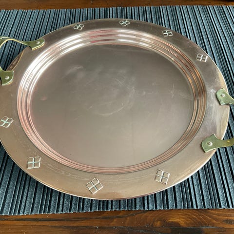 Tarjotin on valmistettu laadukkaasta ruostumattomasta teräksestä, ja sen päädyissä on kauniit, niiteillä kiinnitetyt puiset kahvat (todennäköisesti tiikkiä).