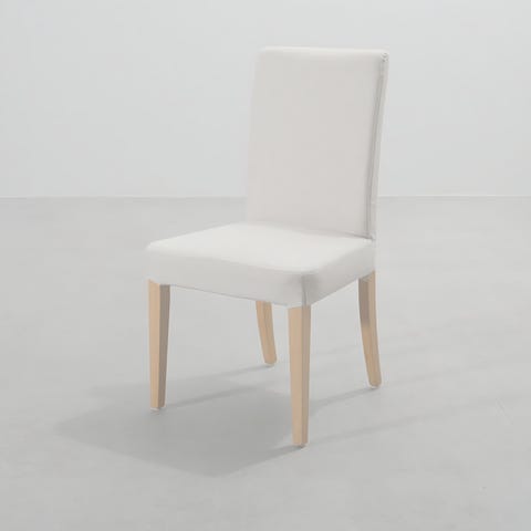 IKEA Henriksdal neljä valkoista tuolia. Tuolit ovat verhoiltuja valkoisella keinonahka materiaalilla ja niissä on tummat jalat. Pöydän saa ilmaiseksi ostaessa tuolit. Pöytä on suorakaiteen muotoinen ja valkoinen.