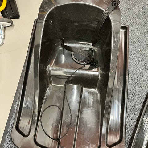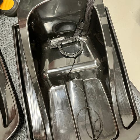 Tummanvihreä Orthex-pulkka. Toisella puolella pulkan reunassa on käsikahva kyydissä olevalle. Vetonarussa on yhdistettynä kaksi narua, eli halutessaan sen voi vaihtaa siistimpään. Nouto Tampereelta Armonkalliolta.