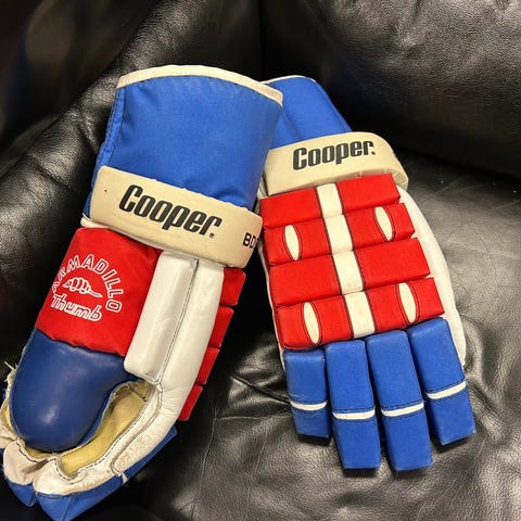 Todella hyvä kuntoiset retro lätkähanskat, koko on 13/14".