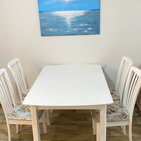 Pyökkipöytä ja kuusi pyökkituolia.