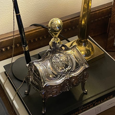 Mummini peruja oleva kaunis, ruusukuvioinen korurasia sametti vuorauksella sisältä. Pohjassa lukee Kultateollisuuden leima. Hintapyyntö 45€, nouto Tampere tai plus postit ostajalle.