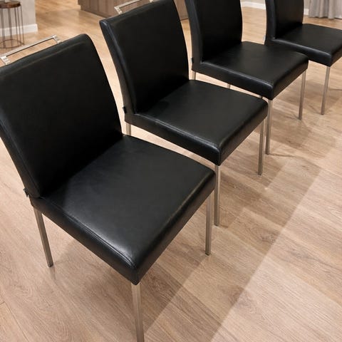 Neljä mustaa tuolia, joissa on kromatut rungot. Tuolit ovat korkeaselkäisiä ja niissä on pehmustetut istuimet.