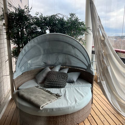 Rottinki pyöreä aurinkosänky vaaleansininen. Sängyssä on vaaleansininen pehmuste ja katos, kaksi raidallista tyynyä. Sopii ulkokäyttöön rentoutumiseen ja aurinkoisille terasseille tai parvekkeille. Värikkäät tyynyt ei tule mukana. Isot tyynyt ei parhaassa kunnossa, mutta muuten kunto hyvä. Halkaisijan arvio noin 1 metriä. Voin mitata, jos tarve