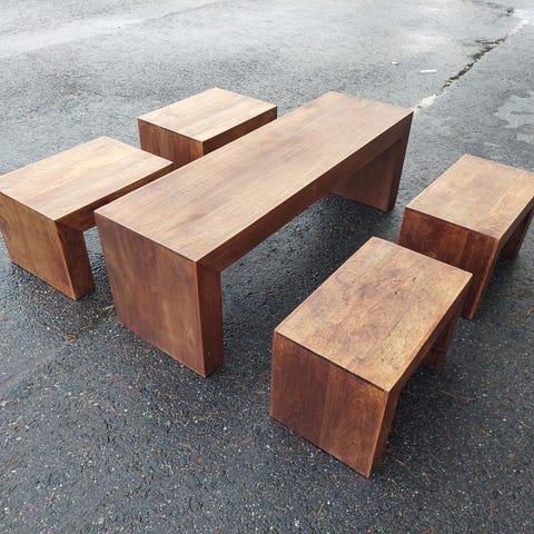 Erittäin tukeva ruokapöytä ja 6 keinomokkaista tuolia. Pöytälevyn paksuus 40 mm
