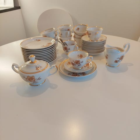 Arabia Myrna astiasto, jossa kukkakuvio ja kullanväriset reunukset. Astiastoon kuuluu 12 lautasta, kuppia ja kahvilautasta sekä sokerikko, kermakko. Materiaali posliinia.