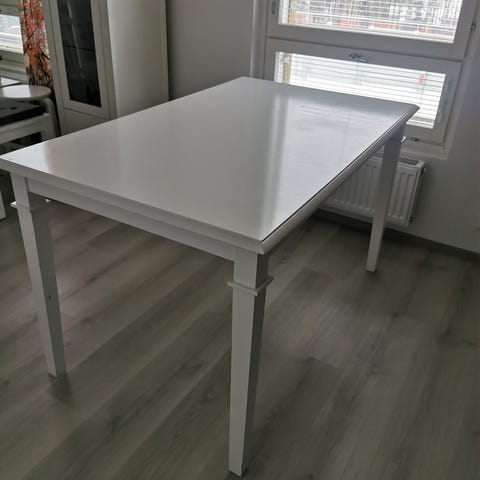 Ruokapöytä puuta tummanruskea 130 cm pitkä , joitain kulumajälkiä, ei isoja naarmuja.