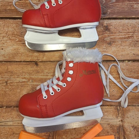 Tyttöjen ihanat hokkarimalliset luistimet. Jotain pientä kulumaa/likaa luistimen varressa ja nauhojen kiinnitys soljissa. Muuten hyvässä kuvan mukaisessa kunnossa.