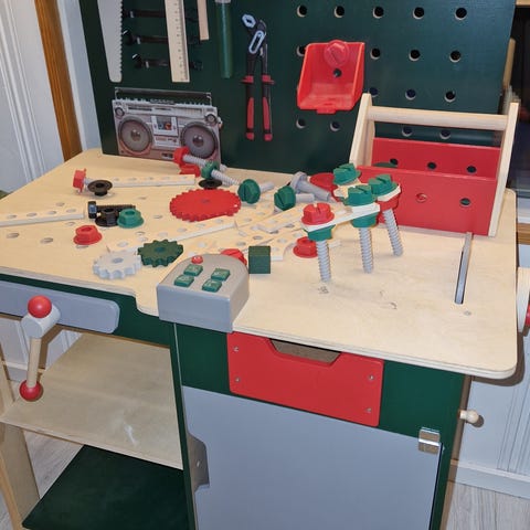 Myydään Parkside-merkkinen lasten puinen työpöytä. Tukeva ja laadukas lelutyöpenkki, jossa mukana useita työkaluja ja tarvikkeita. Sopii mainiosti pienelle nikkarille leikkiin ja roolipeleihin. Pöytälevyssä muutama tarha, jotka näkyvät kuvassa. :)