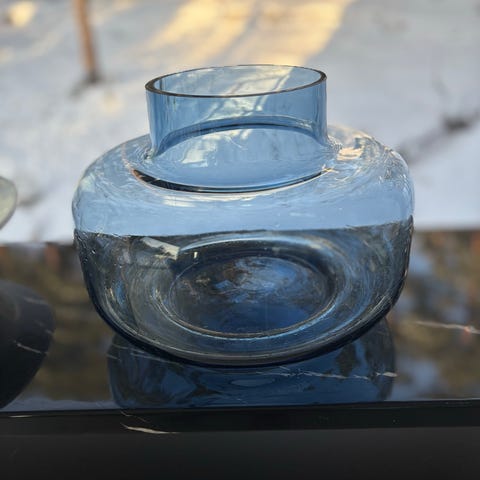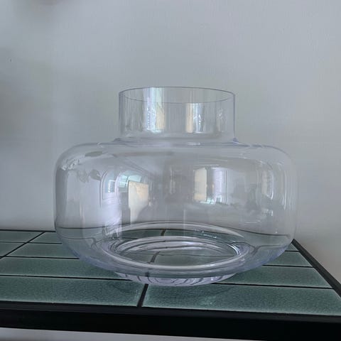 Marimekko Urna vaasi. Lasimaljakko on valmistettu kirkkaasta lasista ja soveltuu kukkien tai koriste-esineiden esillepanoon. Ostettu Marimekon myymälästä lokakuussa -25 ja muutaman kerran olen kukkia sisällä käyttänyt. En ole varma, onko alkuperäinen säilytyslaatikko tallessa ja toki se mukaan tulee, mikäli sen löydän.
