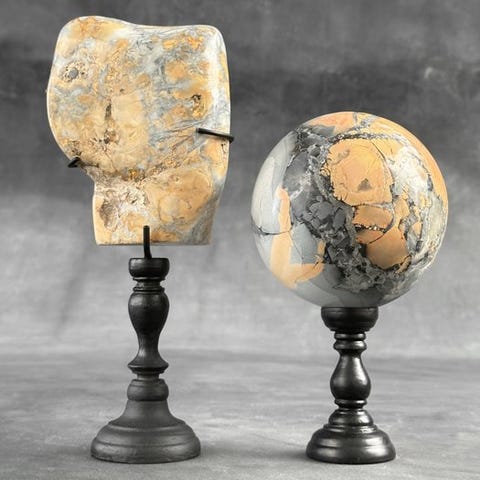 Upea pari keltaista Maligano Jasper -palloa ja simpukkapalloa räätälöidyissä telineissä.