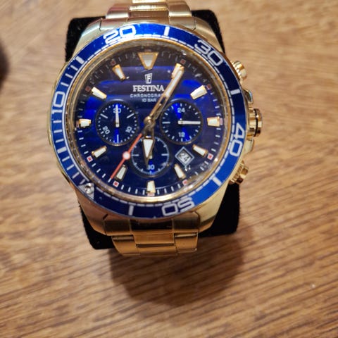 Festina miesten rannekello metallirannekkeella ja tumman sinisellä kellotaululla. Kellossa on useita pienempiä tauluja ajanotto-ominaisuuksia varten. Kello toimitetaan alkuperäisessä Festina-laatikossa.