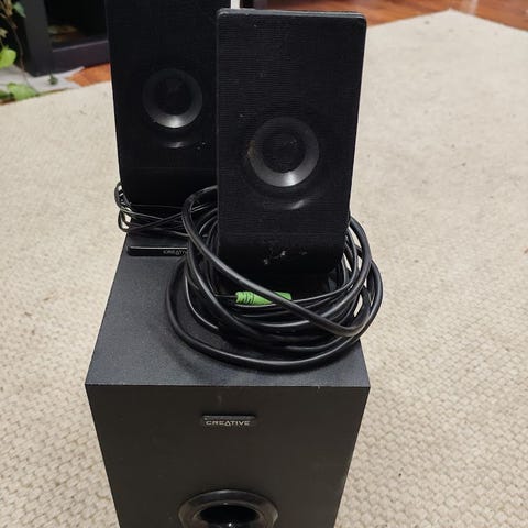 Lähes kayttämättömät tietokonekaiuttimet. Saavat virran usb:n kautta ja ääni 3.5mm liitännästä. Vain nouto Latokaski, Espoo.