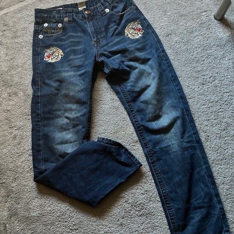 True Religion Ricky farkut sinisenä, valmistettu denimmateriaalista. Koko L (True Religion koko 30) ja vyötärön koko on 32-33. Miehille suunniteltu malli.