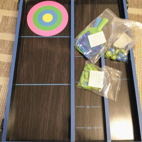 Pöytäcurling tarvikkeineen. Pituus 2750mm leveys 650mm. Pinta moitteeton