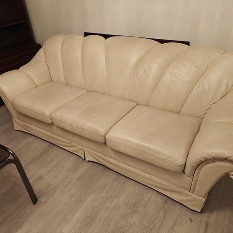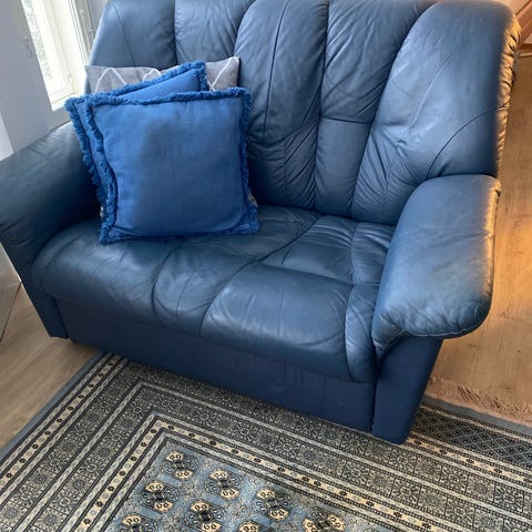 Vaatii hiukan mustaa väriä. Nahka ei ole revennyt Istuinkorkeus on 45 cm. Sohva on Tesomalla.
