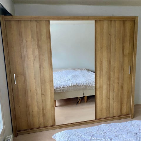 Vaatekaappi, jossa on peiliovet ja kaksi vetolaatikkoa.Tyyli on moderni ja yksinkertainen, sopien monenlaisiin sisustuksiin.Kaappi on hyvässä kunnossa ilman näkyviä vaurioita.Saman sarjan kaksi kaappia myös myynnissä.