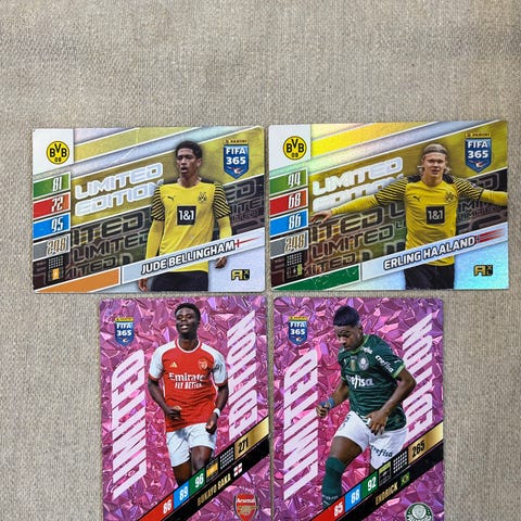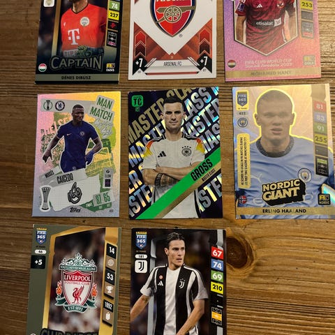On suomalaisten kortteja useita kappaleita. Haaland, Mbappeja useampi yms. Hyvässä kunnossa pääosin, kahdessa Messissä enemmän kulumaa.