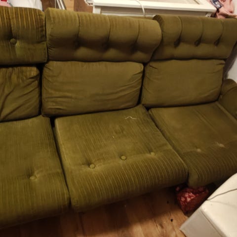 Ehjä, mutta ollut käytössä isovanhemmilla vuosikymmenet, ja meilläkin jo 20 vuotta, joten on kulunut. Levitettävä kahden hengen vuodesohva. Istuimen alla säilytystilaa.