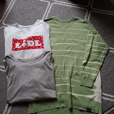 Finlaysonin pitkä paita koko L. Vastaa jopa XXL kokoa. Kai-kai on 68 cm ja olka-helma on 84 cm. Materiaali puuvilla. Sekä valkoinen T-paita koko XL. Kai-kai on 60 cm ja olka-helma on 75 cm. Materiaali puuvilla. ja harmaa lyhythihainen paita koko XL. Kai-kai on 69 cm ja olka-helma on 61 cm. Materiaali polyester/elastaani. Yhteishintaan 10€. Eläimetön ja savuton koti. Löytyy Helsingistä Pihlajistosta mutta postitan myös.