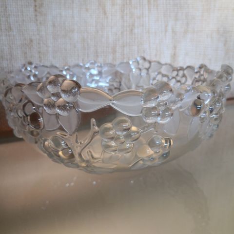 Kukkakuvioisen lasikulhon korkeus 9,5 cm, yläosan halkaisija 23,5 cm.