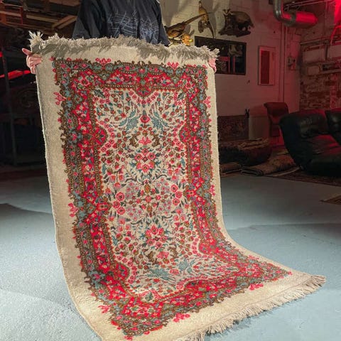 Upea Keshan kirkkaan värisellä pohjalla ja yksityiskohtaisilla kuvioinneilla. Käsinsolmittu villasta.