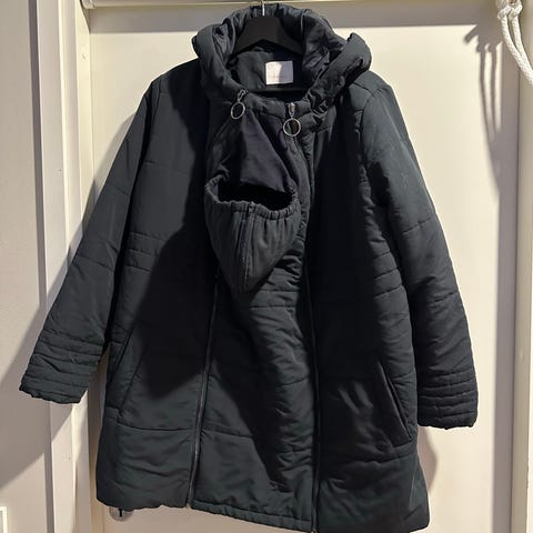 Talvitakki, jossa vaihdettavat lisäosat raskaustakkiin tai vauvan kantamiseen liinassa/kantorepussa edessä. vauvan saa tuulelta ja kylmältä suojaan.eläimetön ja savuton koti, hajusteeton pesu.