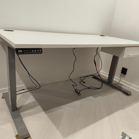 IKEA sähköpöytä mittzon koivuviilu Pöydässä on sähköinen korkeussäätömekanismi 60-124 korkeus säädöllä. Pöytälevyssä näkyy käytön jälkiä,merkattu kuviin(himmeää värikynää). Pöydästä puuttuu johdoille tarkoitetut suojat, yksi osittain paikallaan. Saa varmasti kiinni. Itselle tarpeeton. Kysy ja tarjoa. Pöytä levyn syvyys 48cm. Valkoisen osan pöytä levyn yläpuolella 12cm kokonaissyvyys näin 60cm