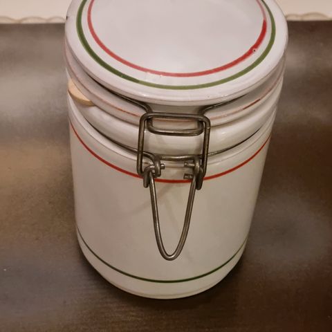 Hyväkuntoinen, ehjä kannellinem säilytyspurkki. Korkeus noin 13 cm.