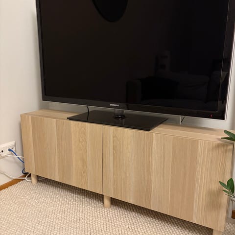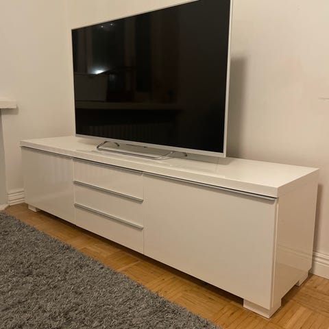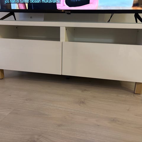 Ikean Bestå tv-taso. Hyvässä kunnossa lukuunottamatta päällä olevaa naarmua. Sen saa vaikka Beståån tarkoitetulla lasilla peittoon. Muuten kuvissa pölyinen, putsaan ennen noutoa! :)