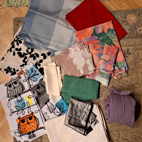 Kasa tukevia kankaita esim. sohvatyynyihin, tuolinpäällisiin ym. Kaikki muut ovat huonekalukankaita paitsi punainen on ohuempaa ja tummansininen Ikean verho napakkaa puuvillaa josta joskus piti tehdä sohvatyynyjä. Oikeassa yläkulmassa on paksua samettimaista kangasta 2 pientä palaa + Ikean jättityynyyn itse ommeltu jonkin aikaa käytössä ollut tyynynpäällinen. Etualalla olevista saa joko tuolinpäällisen tai toisen puolen tyynynpäälliseen, muista saa koko tyynynpäällisen ja ylikin. Olleet tosi monia vuosia lämminvarastossa muovilaatikossa, ei ole pesty paitsi ison tyynyn päällinen on pesty poisratkomisen jälkeen. Nouto tai lähetys. Lähetyskulut ostajalle. Koko kasa 10 e.