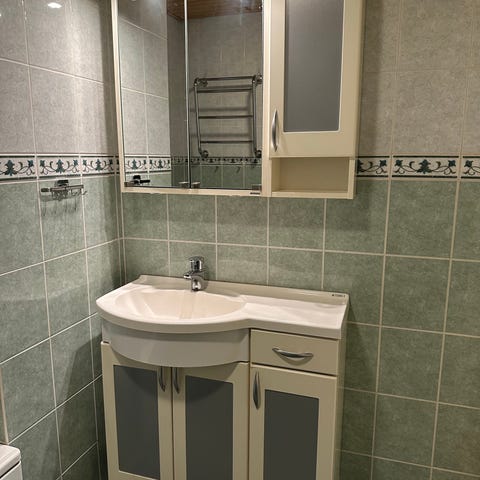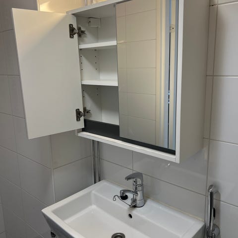 Svedberg 10 v. vanhat hyväkuntoiset peilikaappi,syv.10 cm,k.77 cm, allaskaappi l. 60 cm,allas syv.45 cm,Hansgrohen hana,bideesuihku,