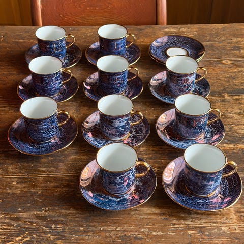 Käyttämättömät, kauniit käsinmaalatut kahvikupit ja tassit kultareunuksin 12kpl