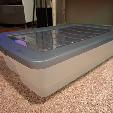 Sängynaluslaatikko kannella ja pyörillä. Pohja roikkuu keskeltä ja siihen on laitettu kalustehuopaa ettei raavi lattiaa. Toisessa päässä on halkeama (näkyy kuvassa) mutta muuten hyvä ja toimiva laatikko. Mitat 76x50x28 cm.