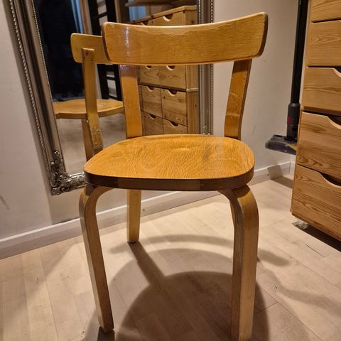 Myynnissä tuoli, ehkä Artek? Lojunut varastossa pitkään ja vaatii pesua ja entisöintiä, muuten ehjä.