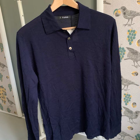 Uutta vastaava, käyttämättä jäänyt open polo -tyylinen ohut merinovillaneule. Tummansininen, koko M. Materiaali 100% merinovillaa.