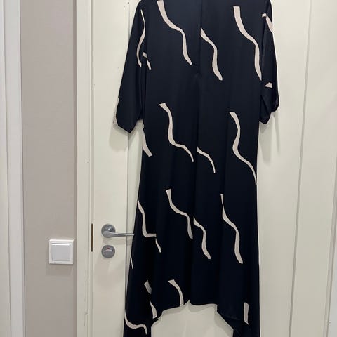 Pari kertaa pidetty Marimekon kotelomekko Katleija. Pohjaväri todella tummanvihreä, näyttää lähinnä mustalta. Hento vaaleanpunainen ja valkoinen kasvikuvio. Koko 36. Valkoinen vuori. Sivutaskut. Takana vetoketju.