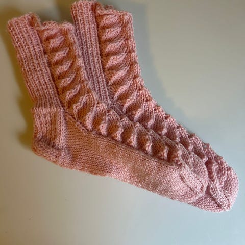Valkeat villasukat, neulottu 7-veljestä langasta.