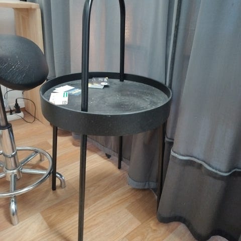 Artek tyylinen (huom, ei aito) sivupöytä/tarjoiluvaunu jossa vaaleanpuinen runko ja valkoiset tasot. Pöydässä kaksi tasoa, jotka tarjoavat lisätilaa säilytykseen tai esineiden asettamiseen. Pohjassa rullat joiden avulla pöytä liikkuu kepeästi.