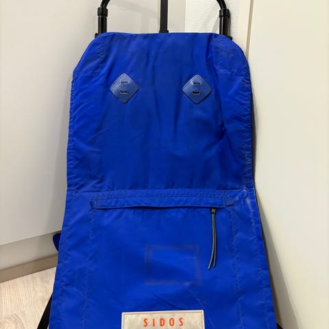 Vaaleansininen kantoreppu, jossa on säädettävät olkahihnat ja tukeva runko. Sopii erilaisten tavaroiden kantamiseen, esimerkiksi retkeilyyn tai arkeen.