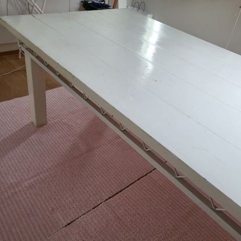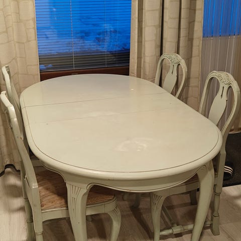 Maalaisrokokoo tyylinen jatkettava ruokapöytä ja 6tuolia.