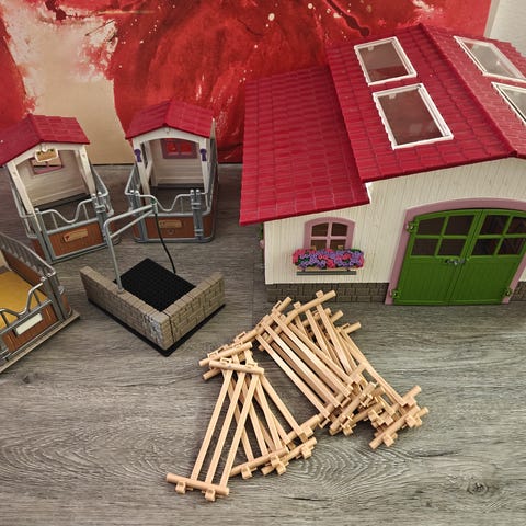 Myydään Schleich talli 42344 ja tavarat. Lähes kaikki alkuperäiset tavarat mukana. Muutama pikku osa puuttuu, mutta tilalla viisi lisäpaalia ja loimi. Talli täysin kunnossa.