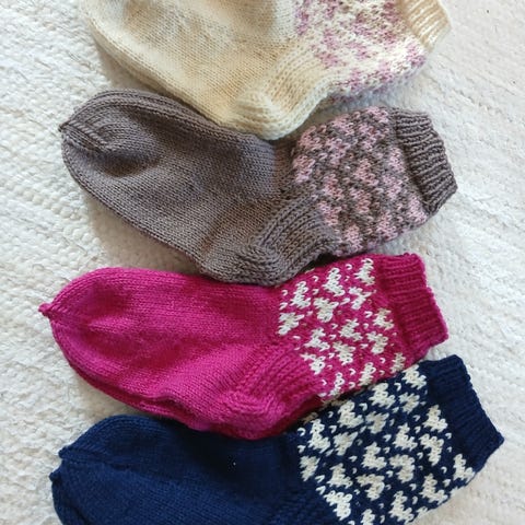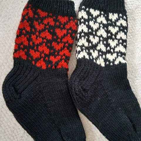 Uudet pitkävartiset vahvasta sukkalangasta kudotut villasukat; terän pituus 22,5 cm ja varren pituus 27 cm. Langan koostumus 75 % villaa ja 25 % polyamidia. Hinta 20 euroa.