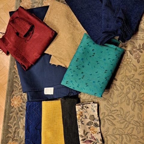 Kasa sekalaisia kankaita. Luonnonvalkoinen mustilla lehtikuvioilla on iso verho tukevaa puuvillaa. Sininen kangas on ohutta ja liukasta, ei läpinäkyvää verhojangasta, punainen on puuvillaa, toinen sivu päärmätty. Lohenpunaoranssi-vihreä on tukevaa kiiltävää ehkäs puuvillaa. Harmahtava vaaleahko violetti pilvikangaspalat on puuvillaa. Pöllökankaasta saa pöllö-tyynynpäällisen. Valkoinen kiiltävä kangas keskellä on kaiketi vuorikangasta. Vihreät palat on puuvillaa. Metallunhohtava sisäpuolelta musta pala on venyvää tukevaa kangasta. Etualalla valkoinen kökerrys -pöytäliina (taiteellinen oma näkemys pyöreästä pöytäliinasta), himmeitä valkoisia kuvioita, vinonauhareuna. Harmahtavan vaalean violetti kerä on joustavaa collegea. Sisäpinta paksu karvainen. Kankaat ovat olleet tosi monta vuotta lämpimässä varastossa muovilaatikossa, ei ole pesty. Koko kasa 10 e. Nouto tai lähetys. Lähetyskulut ostajalle.