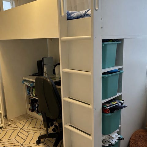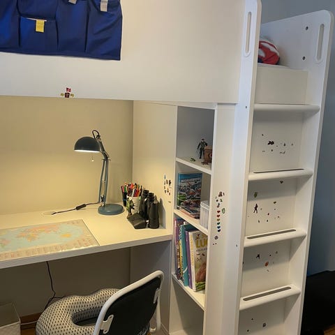 Keväällä 2024 uutena ostettu Ikean parvisänky. Täysin ehjä. Pöytälevyssä muutama tahra liimasta. Yritetään poistaa vielä. Muuten siisti ja hyvässä kunnossa oleva muuntautuva parvisänky. Ohjeet löytyy. Lisäkuvia saa pyytämällä. Ensimmäinen kuva Ikean.