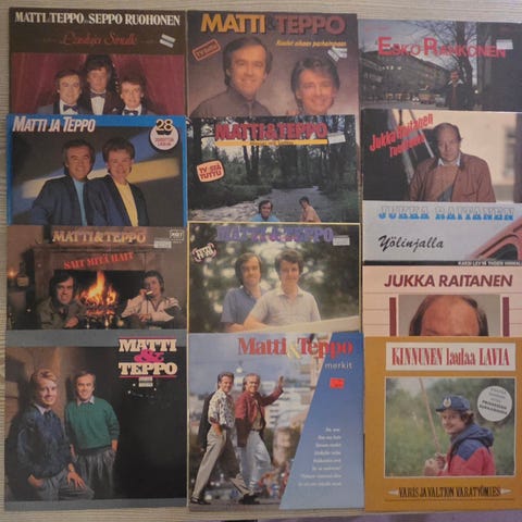 Kokoelma suomalaisia LP-levyjä, joissa esiintyy useita eri artisteja, Danny ja Armi, Kake Randelin, Kai Hyttinen, Markku Aro, Kari Tapio, Matti Esko ym. Hyvässä kunnossa, toridiilillä nippuna matkaan.